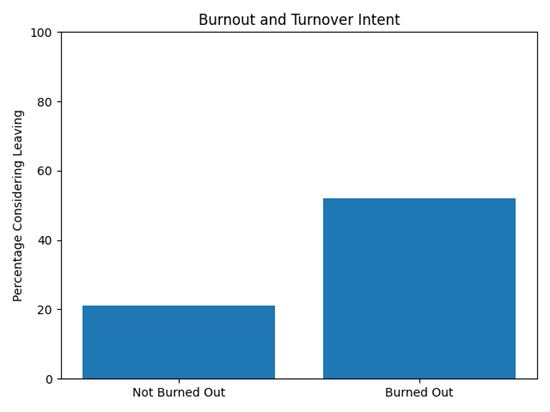 Burned-out employees report significantly higher intent to leave, making burnout a leading indicator of future turnover.